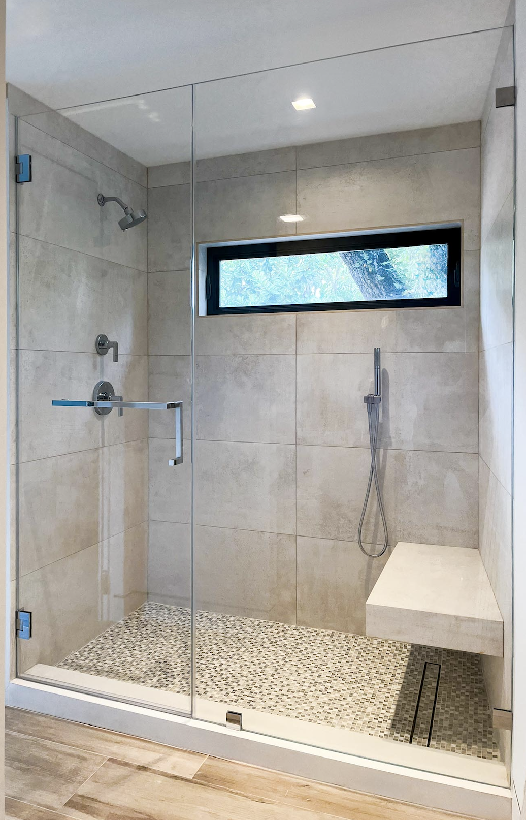 Sleek and timeless, our frameless swinging doors offer dual-swing capability with minimal hardware. Works beautifully alone or paired with fixed glass panels.